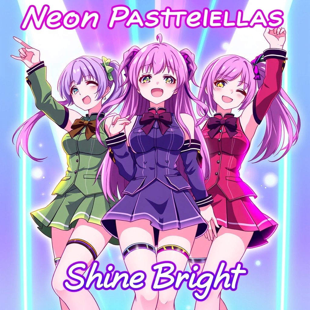 English and three girls sing a song about how they are unstoppable and it called shine bright and the bands name is neon pastaellas and they are anime girls