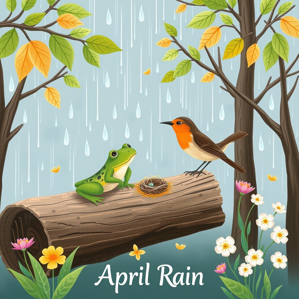April rain is here again; Hear it pitter, pitter, patter, On the leaves and on the trees, See it spitter, spitter, spatter. Rain, oh rain, don't go away We need you for flow'rs in May; Drip, drip, drop and do not stop, Send a little rain our way. On a log sits Mister Frog, Can you hear him calling, calling? Poking fun at Mister Sun, As the rain keeps falling, falling. Mrs. Robin builds her nest, Rainy days she loves the best; Drip, drip, drop and do not stop, Send a little rain our way. Classical, Happy, Male & Female Duet