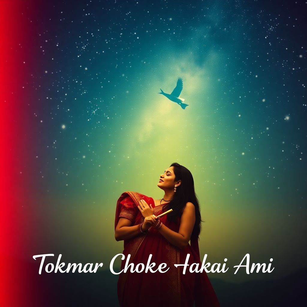 90s Bollywood romantic duet melody in Kumar Sanu and Alka Yagnik style, male-female vocals alternating, slow rhythmic 4/4 beat at 80-90 BPM, dreamy flute intro, tabla dhun-tak rhythm, light guitar riffs, Sambalpuri folk fusion like "Rasa Jamudali" tune, emotional swelling strings in chorus, swaying folk percussion. Hook repeats with chorus claps. [Verse 1 - Male] রাতের আকাশে তারা জ্বলে, তোমার মুখে হাসি ফোটে হাওয়ায় ভাসে গন্ধ তোমার, দিল ধড়পড় করে কাঁপে [Verse 1 - Female] চাঁদের আলোয় তোমায় দেখি, হৃদয়ে বাজে সুর মধুর তোমার কথায় মিলে সুখ, এই ভালোবাসা চিরকাল ধরে [Chorus - Duet] তোমার চোখে হারাই আমি, তোমায় নিয়ে স্বপ্ন দেখাই হাতে হাত রেখে চলি যাই, এই পথে চিরদিন চলাই! [Verse 2 - Male] বৃষ্টির ফোঁটায় ভিজে যাই, তোমার কাছে এসে দাঁড়াই লাল গোলাপ তোমার জন্য, এই দিল দিয়ে গেয়ে যাই [Verse 2 - Female] সকালের রোদে তোমায় খুঁজি, রাতে স্বপ্নে তোমায় আঁকি তোমার ছোঁয়ায় জাগে প্রেম, এই গানে মিলে যাই আমরা [Chorus - Duet x2] তোমার চোখে হারাই আমি, তোমায় নিয়ে স্বপ্ন দেখাই হাতে হাত রেখে চলি যাই, এই পথে চিরদিন চলাই! [Outro] তোমার চোখে হারাই আমি... (fade with flute)