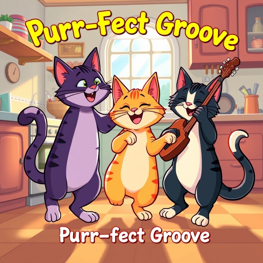 Title: Purr-Fect Groove (Tempo: Upbeat, Funk/Jazz feel) (Verse 1) Sunlight hits the kitchen floor Sunbeam dancer, watch 'em soar Fuzzy tails, a little twitch Tailored for the highest pitch From the sofa to the chair Happy cats without a care (Chorus) Oh, we got that feline groove Watch the little paw pads move Purring loud, a happy tune Dancing underneath the moon Yeah, we got that feline groove Happy, happy, happy cats! (Verse 2) Chasing shadows, playing tag Watch the little whiskers wag Soft and light, they jump and leap Then it’s time for cozy sleep Curlin' up into a ball Happy cats, they love it all (Chorus) Oh, we got that feline groove Watch the little paw pads move Purring loud, a happy tune Dancing underneath the moon Yeah, we got that feline groove Happy, happy, happy cats! (Bridge) With a meow and a little shake What a happy sound they make They bring the rhythm; they bring the beat Furry dancers on four feet (Chorus) Oh, we got that feline groove Watch the little paw pads move Purring loud, a happy tune Dancing underneath the moon Yeah, we got that feline groove Happy, happy, happy cats! (Outro) Yeah, the cats are feeling fine In the groove, they always shine Happy... yeah... (Fade out)
