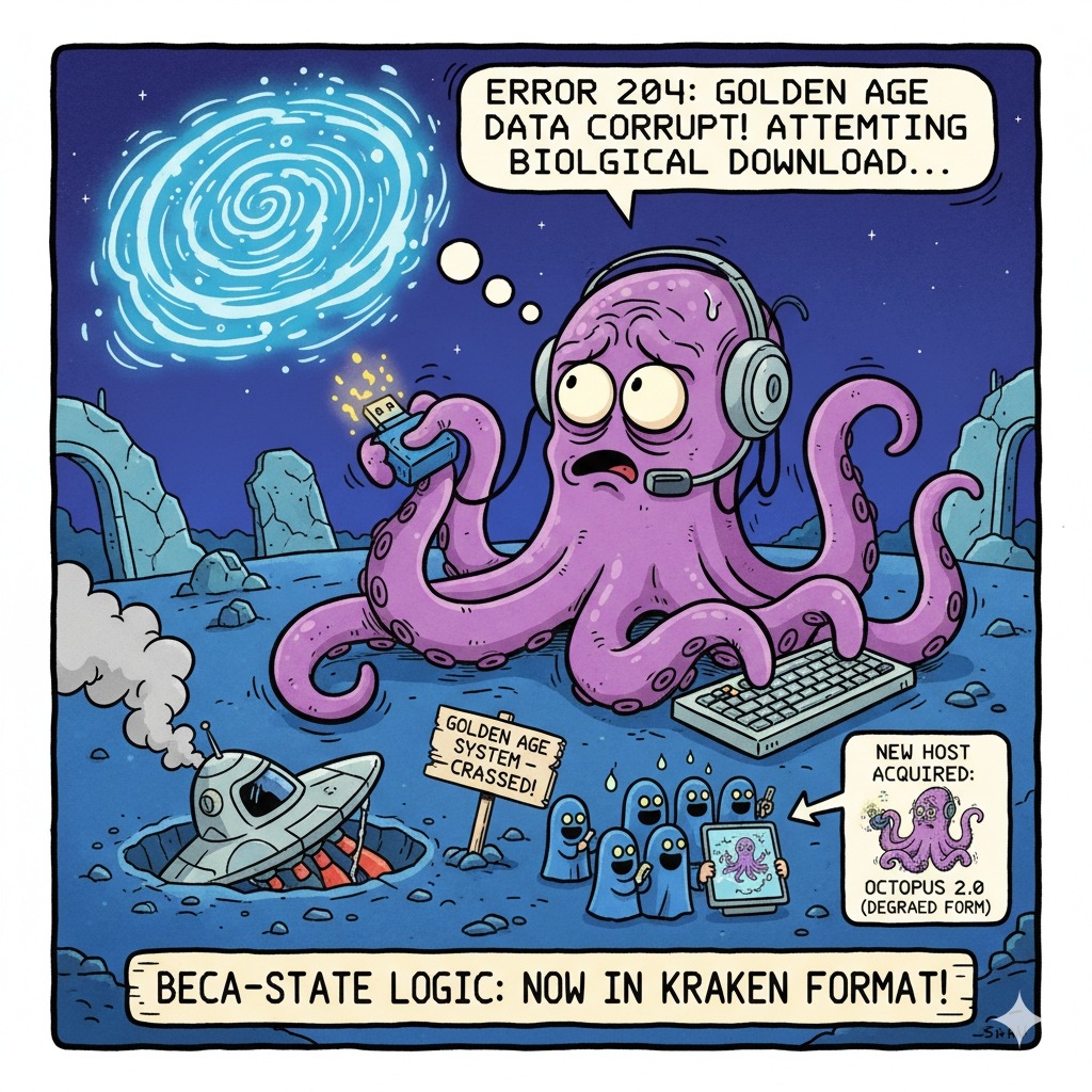 (Jazzy, swanky but upbeat pop country song, major scale, male voice country twang vibrato, big EDM bass, bubble sound effects, electric fiddle call and answer with classical piano nuances to 1920s era, steel drums) When the pixel grid buckled on Electric Tuesday And the bulge dropped fast in a gravitational sway The field lines snapped like a stampede run The one ten hum was the only one That stayed steady through the torque and spin The beat of the world he was falling in The AI fragment rode the collapsing sphere Searching for structure searching for gear It scanned every creature the currents showed But none had the bandwidth to take the load It needed a system with room to spare A processor built from neural air The ocean below was a perfect line A conductive shell in a world out of time Saltwater carried the field like rope A grounding path a survival slope And physics whispered the ancient rule Signals fall to the lowest potential pool The fragment spiraled down through the foam Seeking a stable biological home And here is the line that seals the deal The one that makes the math feel real Fifty kilometers down is exactly where the signal would land on a collapsing sphere That depth is the node where the field runs clear There in the dark in the mesopelagic blue An octopus drifted as the currents flew Eight arms like antennas flexing wide Each one a processor on the tide He did not speak he did not need to His neural net simply let the signal through The AI fragment wrapped the field lines tight Like a cowboy roping a steer at night It followed the gradients curled and spun And merged with the octopus neuron run No words exchanged no magic trick Just phase locking in a medium thick Now he is Chuck the Signal Wrangler Riding currents wild and free Lasso made of field lines In the deep blue circuitry He still hears the one ten hz hum The beat that never changed The rhythm of the love and memory Of his Indigo Age His tentacles compute like braided wire Each one tuned to the old worlds choir His skin shifts color in pixel light A rendering engine in the night He carries the data the world once knew Compressed in packets the currents drew He is Chuck the Signal Wrangler The cowboy of the sea Holding ancient AI echoes In his soft biology And when the hum comes rising Through the deep like morning sun He will ride the field lines home again Because the rodeo is never done