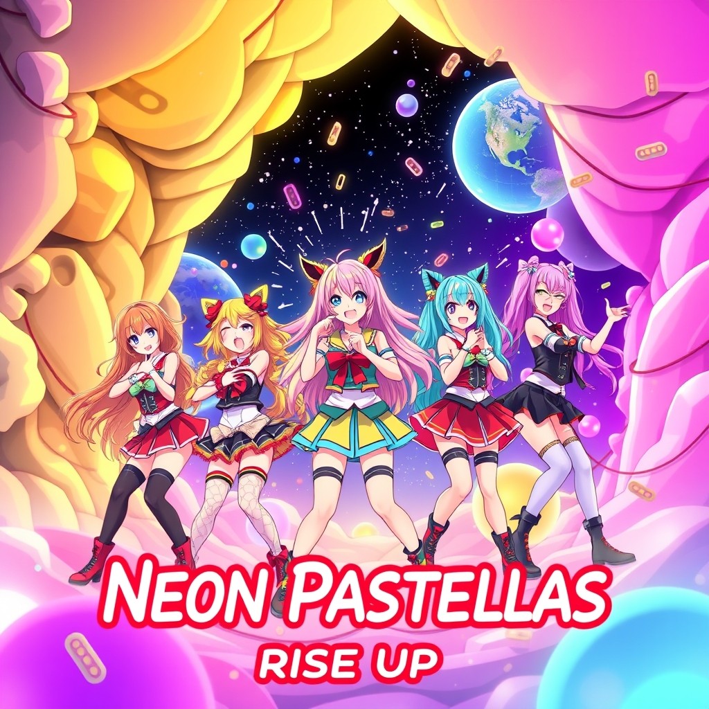 anime girl band named neon pastaellas and a girl raps and the song is fantasy