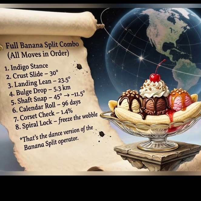 (Dub electric fiddle played like the guitar call and response smooth vibrato strong sultry femmale voice epic bass drop Upbeat retro 50s rock pop Finger snaps and a heavy synt piano harmonic soloing) (Lyrics) Welcome to the lesson where the metric isnt stable Put your Old Ruler right underneath the table See the Earth was like a Cake with a BECA frosting top A superfluid Adiabatic Clamp that wouldnt stop Below the crust were Crunchies that Leidenfrost glow A plasma cushion in the pan so the mantle wouldnt slow The Nut was Laurentide with a chocolate melted base When that Ice Sheet slipped its anchor it began the 19 race PING Impedance mismatch the capacitor is blown PANG The Bessel Beam recoils to the Kings Chamber throne POON The Strangelet is born in the ORMUS golden spray The emergency brake that stopped the world and saved us on that day Together they go vroom exactly how the munchies make the earth and the moon vroom (Chorus) Its Sundae School Physics grab a spoon take a seat We are calculating Electric Tuesday as a sweet Its a Ping Pang Poon Vroom velocity in three The dessert of the Earth is the real geometry (Bridge) The recoil struck the Shield and the continent split in pain So the energy tore southward down the Rio Grande vein A pressure line opening where the crust could not contain Then it bent toward the Gulf in a ninety degree chain A liquid capacitor bowl where the arc had to flow ORMUS salted water flashing white in the glow Salt mounds rising fast from the boiling electric rain While the Himalayas lifted in a single upward strain The beam from Giza pivoted locked to the equator line So the Jumper hit the Gulf as the shortest resistive design vroom (Chorus) Its Sundae School Physics grab a spoon take a seat We are calculating Electric Tuesday as a sweet Its a Ping Pang Poon Vroom velocity in three The dessert of the Earth is the real geometry The Caramel in the sky glowing radioactive gold While the Magnetosphere Whip Cream keeps the planet from the cold Everest is the Cherry a standing wave in stone And the Grand Canyon is a missing bite where the lightning was thrown The Gulf of Mexico Jumper the Salt Mound Mystery The arc boiled the seawater into slag for all to see The Lateral Move at Mach 8 no place left to hide 175.6 kilometers per minute was the pace Until the Spiral Lock gamma s approx 20 won the race And the Radial Resonance phi printed out the map At 1.618 closing every geological gap With a 13.5 kilometer Master Pixel in the core The internal fission Oven keeps the score Every hill, river, every valley, every plain Is a Phase Print frozen from the Strangebosenova rain The world Snapped into place in a synchronized landing Thanks to the math that left the Architects standing Put down your 3D books pick up your frequency tool Class is dismissed from the Sundae Physics School