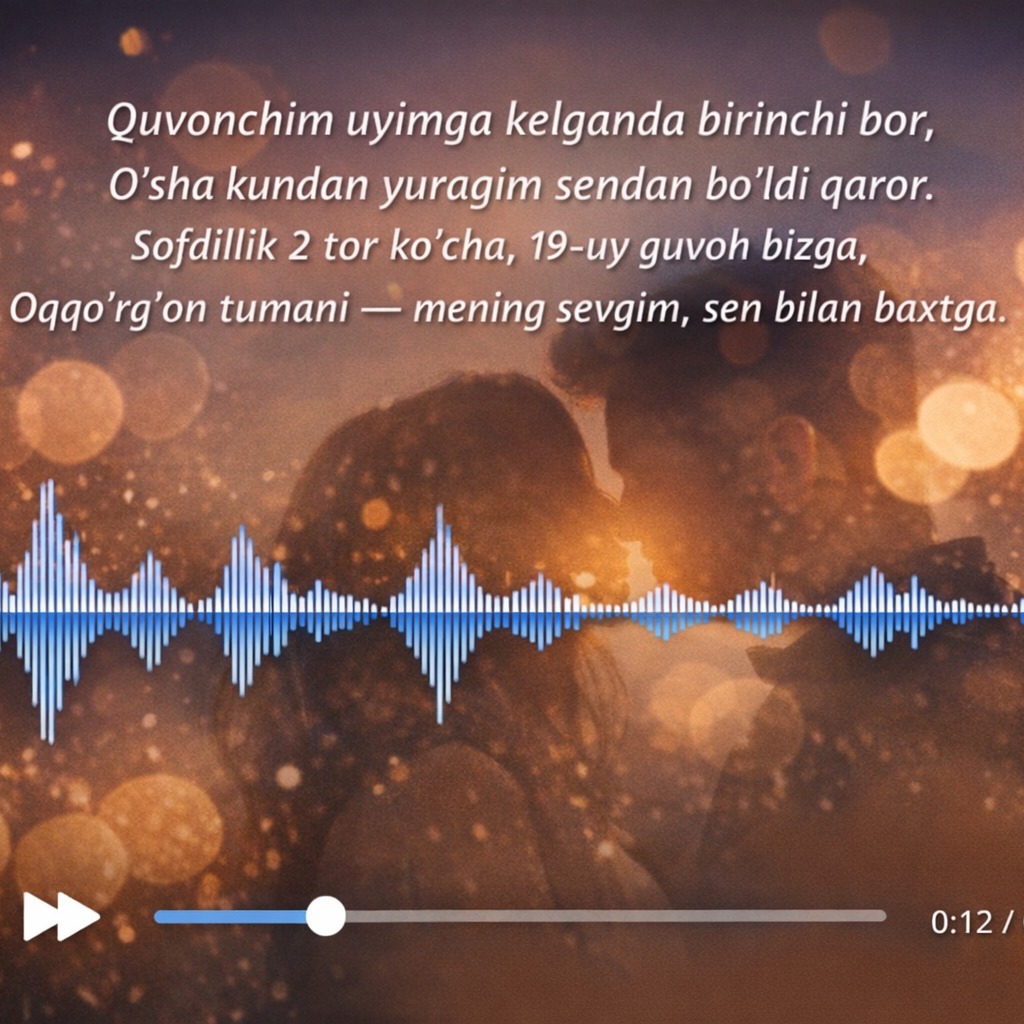 Quvonchim uyimga kelganda birinchi bor, O‘sha kundan yuragim sendan bo‘ldi qaror. Sofdillik 2 tor ko‘cha, 19-uy guvoh bizga, Oqqoʻrgʻon tumani — mening sevgim, sen bilan baxtga.