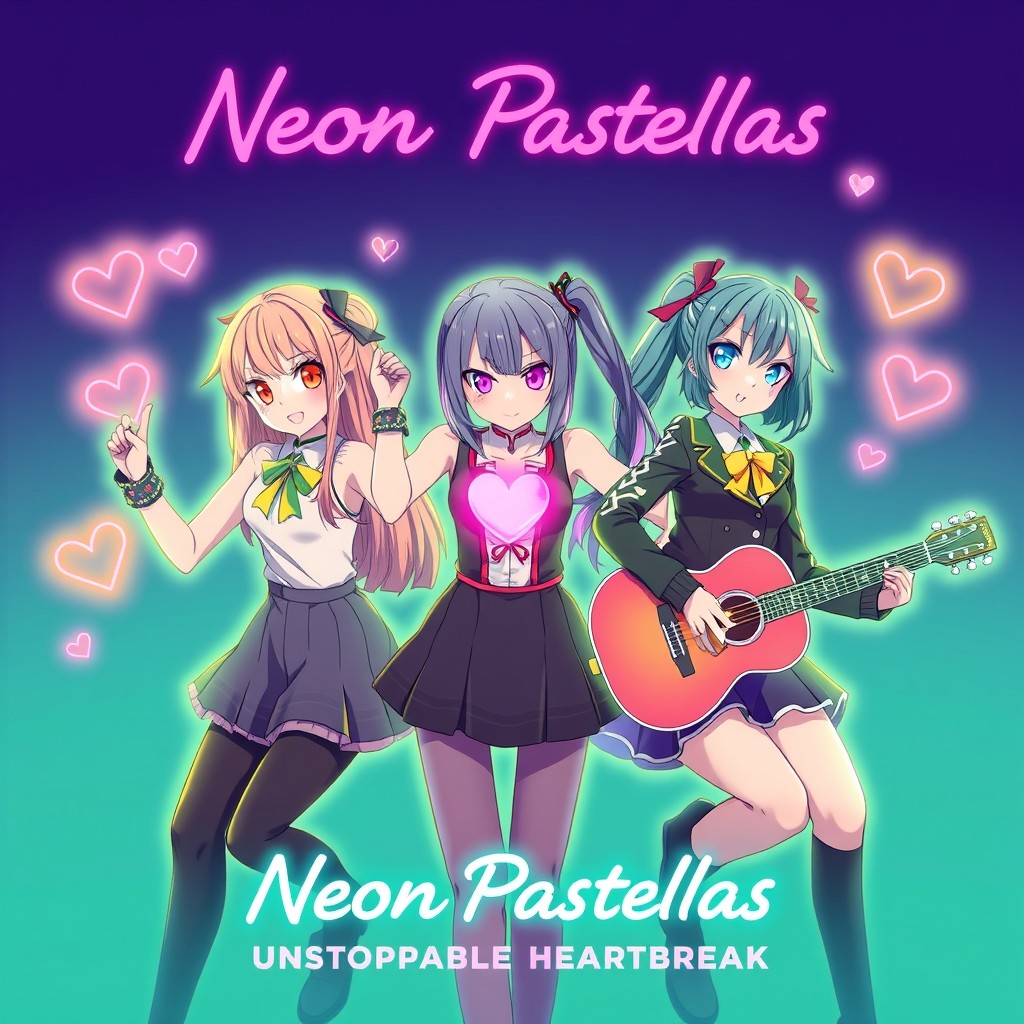 English and three girls sing a song about how they are unstoppable and it called heart break and the bands name is neon pastaellas and they are anime girls and it as a piano and a acrostic guitar